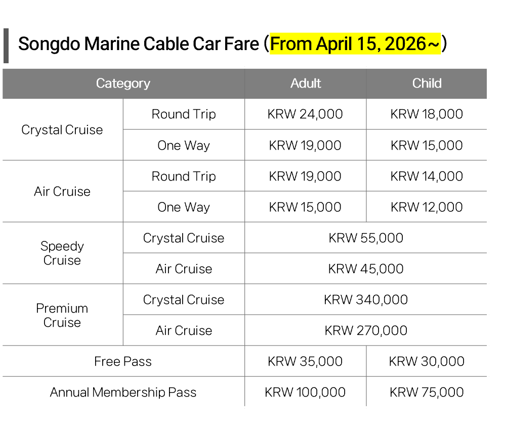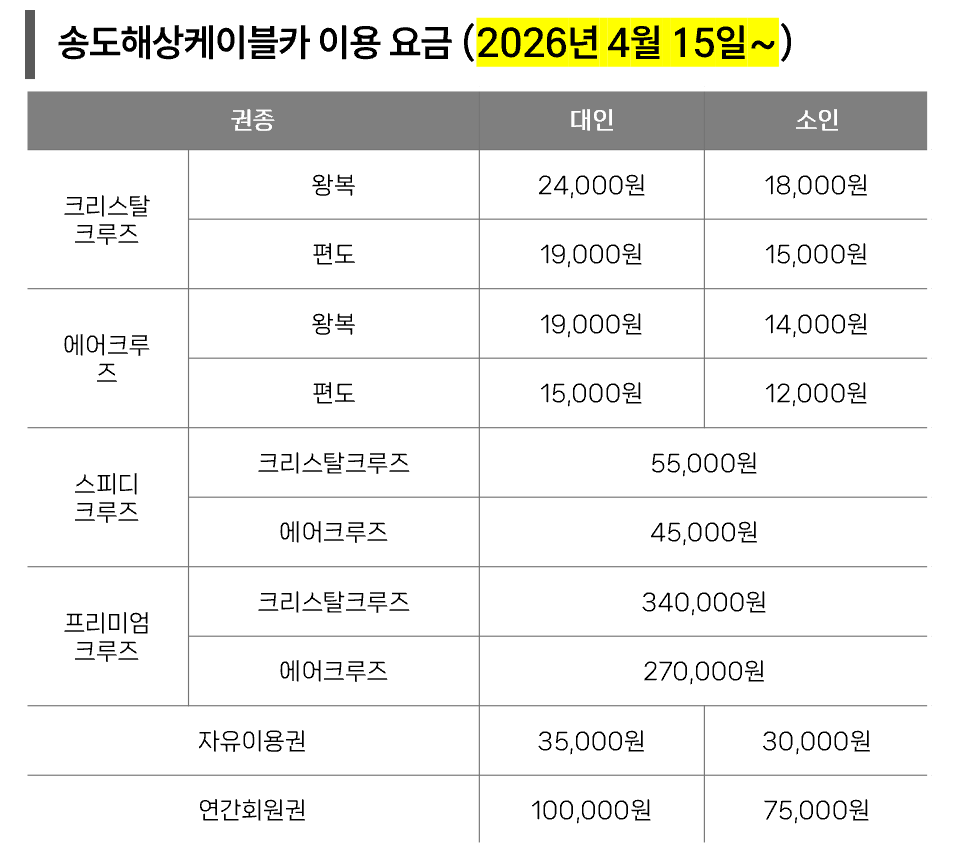 케이블카 이용요금이 4월 15일(수)부터 다음과 같이 변경됩니다.